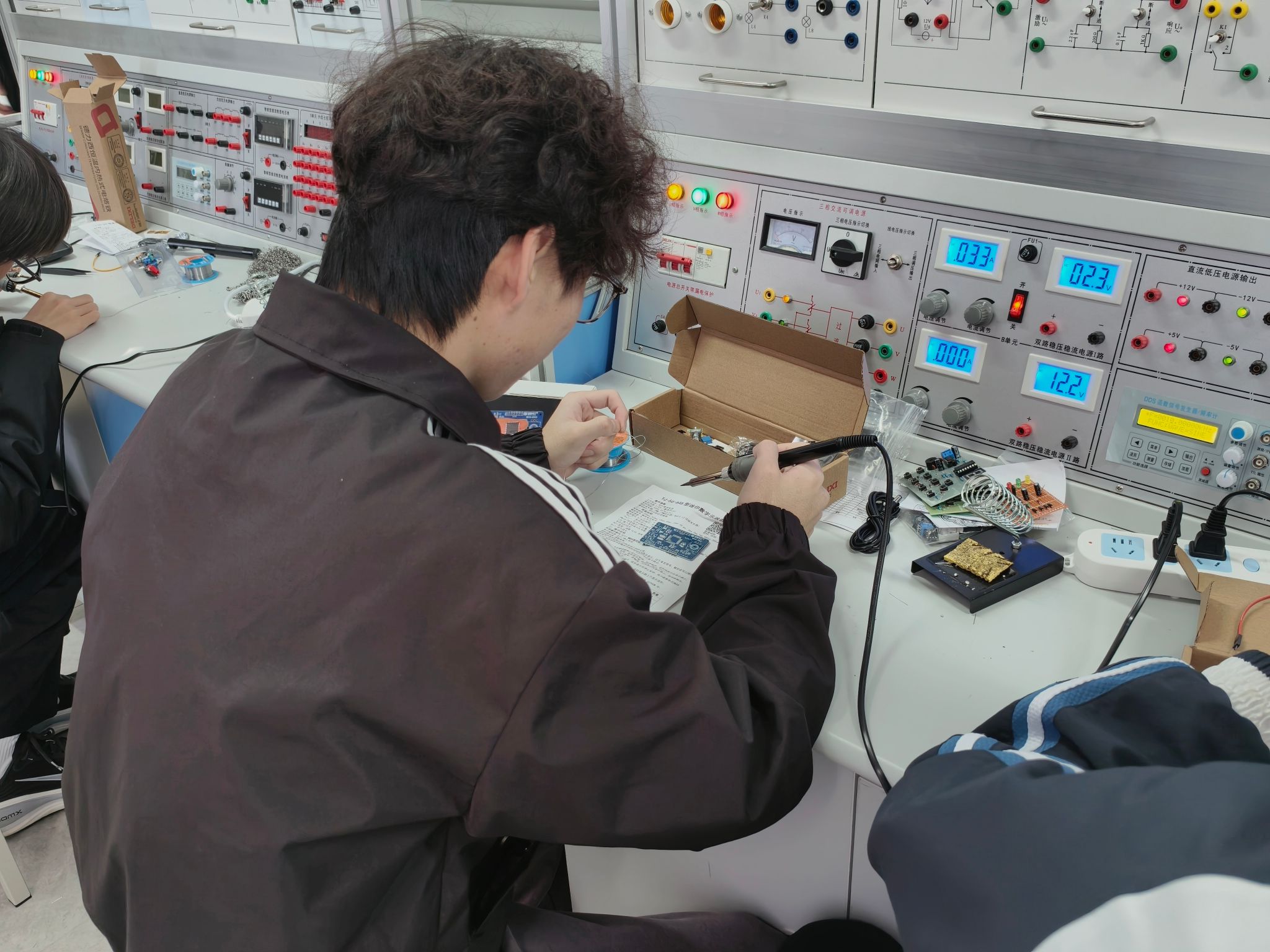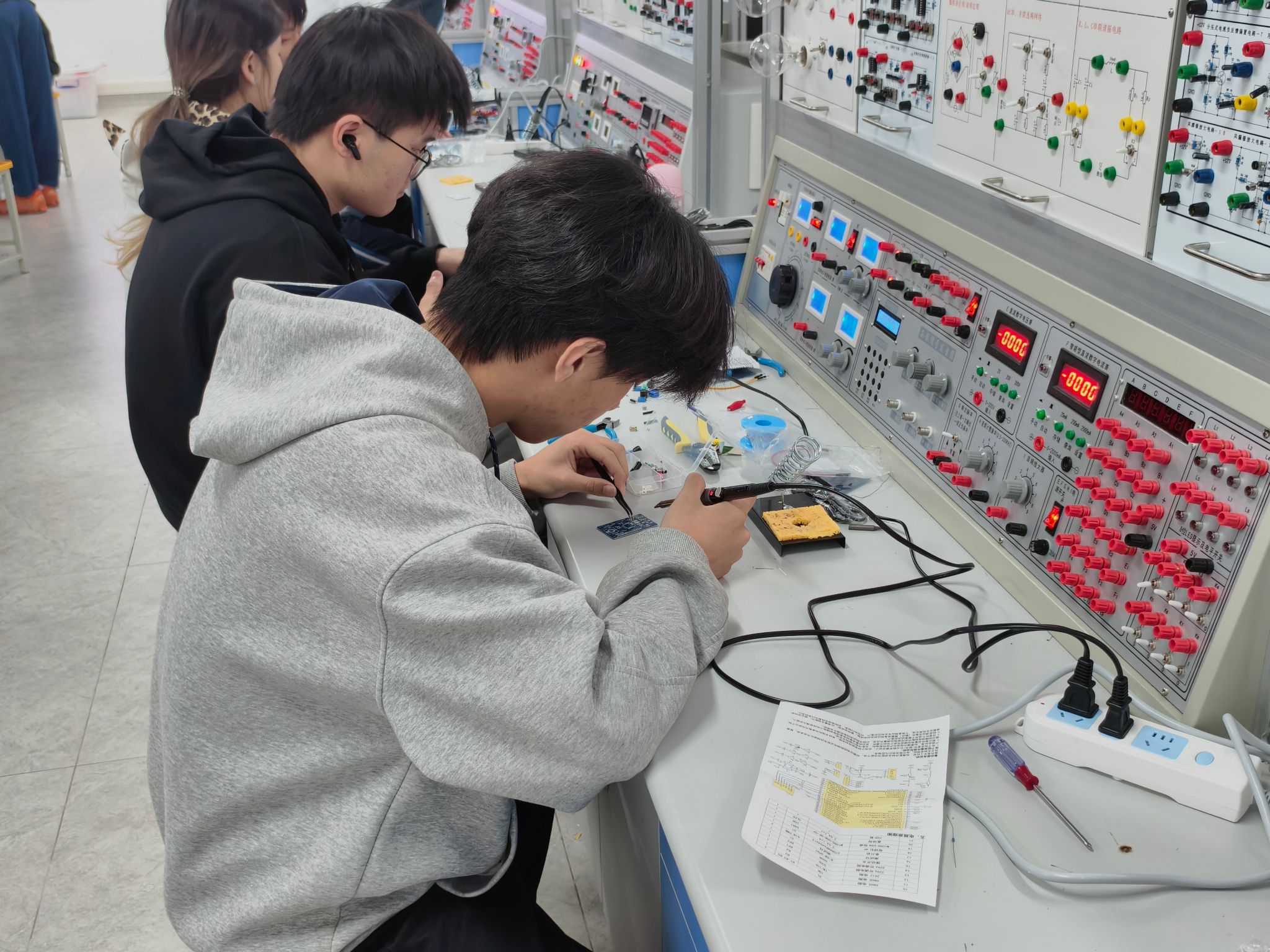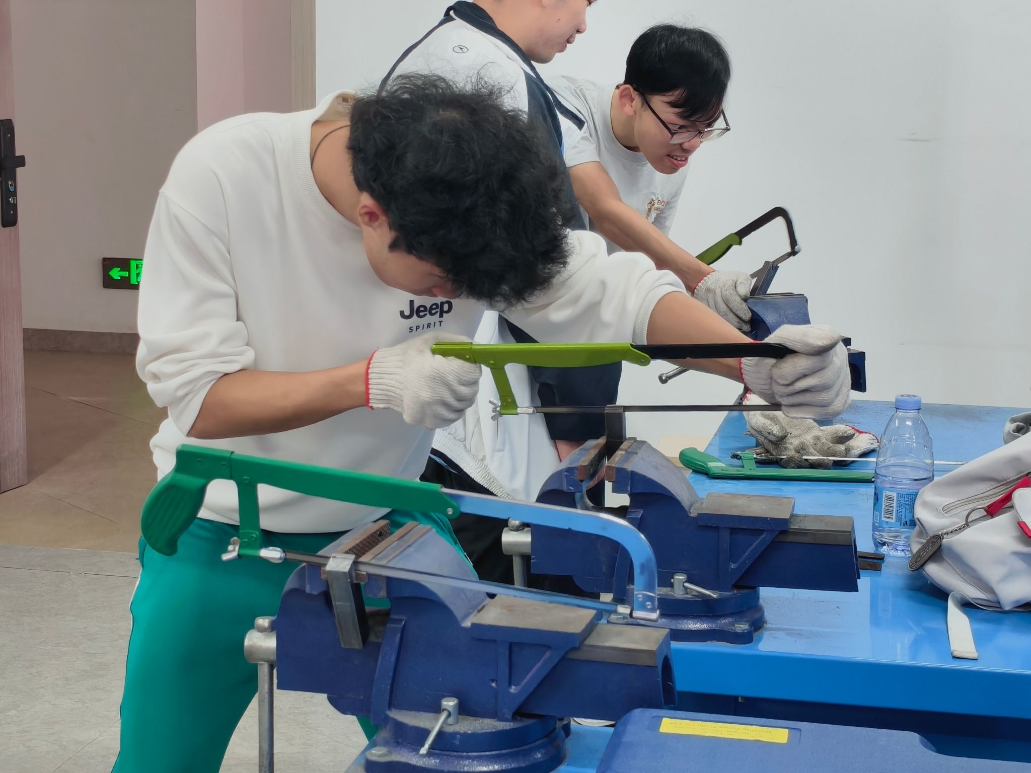 本次课程聚焦钳工实操与电子电路两大核心模块,采用理实一体化教学模式,将理论讲解、示范操作与动手实践紧密结合。在钳工实训区,同学们严格遵守操作规范,佩戴好防护用具,借助台虎钳、手锯、锉刀等工具,从工件划线、锯割、锉削到打磨抛光,每一个环节都认真对待、一丝不苟。看似简单的金属加工操作,既考验动手能力,更磨练耐心与专注力,同学们在反复练习中熟悉工艺要领,树立质量意识与标准意识。在电子电路实训区,大家手持电烙铁、万用表等专业仪器,严谨完成元器件识别、焊接、电路搭建与调试等任务。面对线路连接、参数检测、故障排查等实际问题,同学们主动思考、积极尝试,将课堂上学到的电路原理、电子技术知识转化为实实在在的操作能力,在动手实践中提升逻辑思维与问题解决能力。