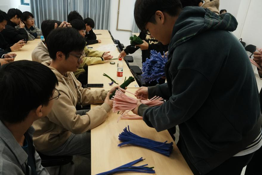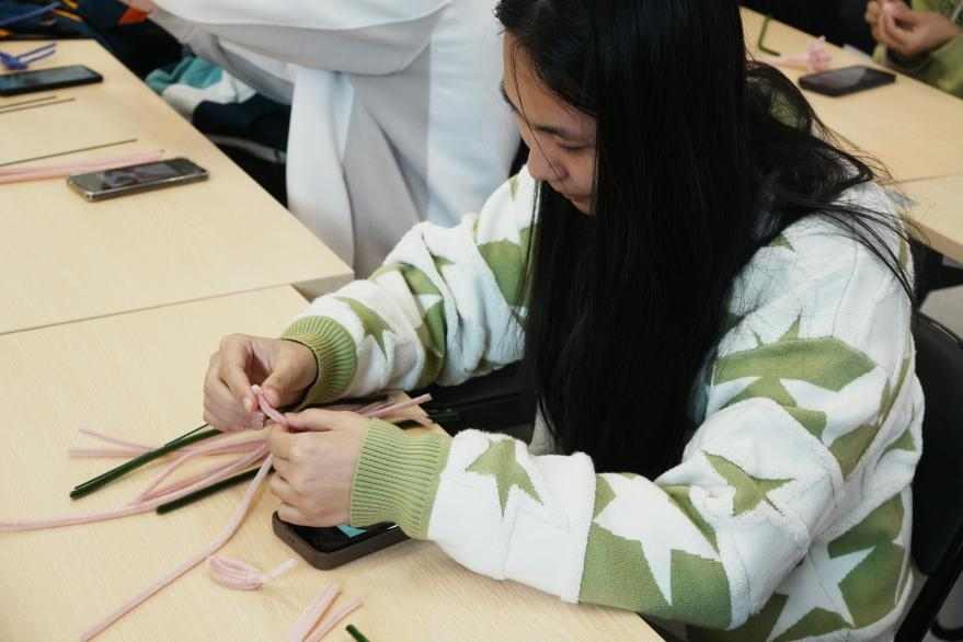活动中,学生们在志愿者的指导下亲自动手制作扭扭棒花。他们认真观看教学视频,动手实践,将普通的扭扭棒编织成色彩斑斓的花朵。这一环节不仅让学生们享受到了动手创造的乐趣,更让他们深刻体会到了感恩的真谛。